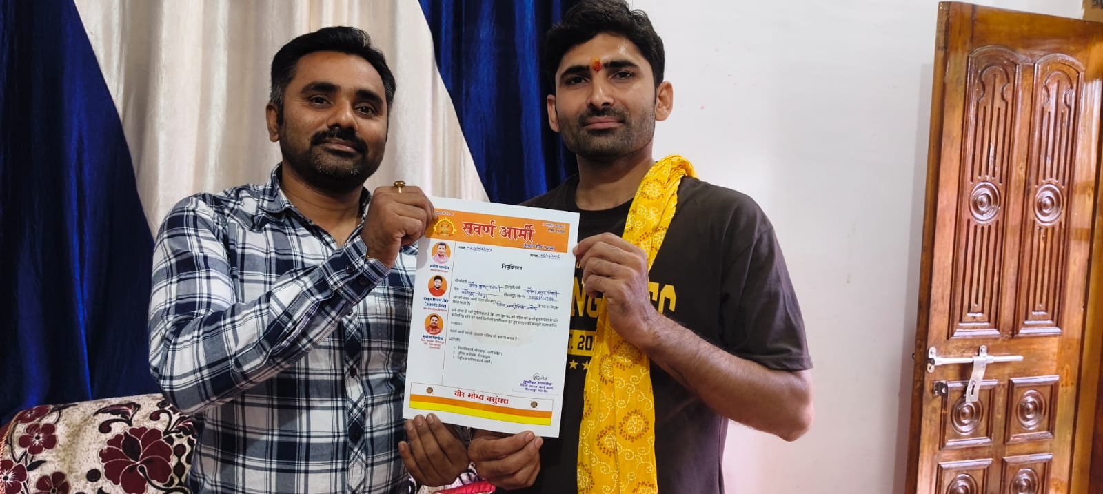 मिर्जापुर जिला अध्यक्ष मुकेश पाण्डेय ने मिर्जापुर जनपद से तेज तर्रार युवा नेता सवर्ण विचारों से परिपूर्ण व हमेशा सवर्ण की लड़ाई लड़ने में तत्पर पहाड़ी ब्लाक के कातोपुर निवासी देवेंद्र तिवारी को नियुक्ति पत्र देते हुए सवर्ण आर्मी मिर्जापुर का जिला प्रभारी विधि प्रकोष्ठ नियुक्त किया गया नियुक्ति पत्र देते हुए मुकेश पाण्डेय ने विश्वास जताया कि तिवारी को जुड़ने से संगठन में मजबूती आएगी।