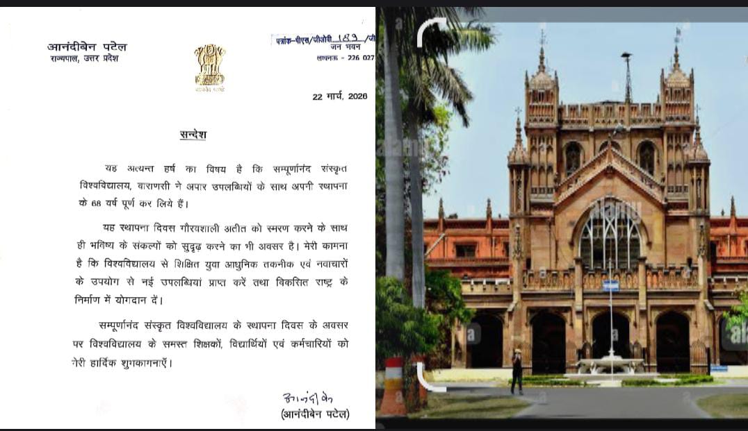 वाराणसी।सम्पूर्णानन्द संस्कृत विश्वविद्यालय के स्थापना दिवस के पावन अवसर पर उत्तर प्रदेश की महामहिम राज्यपाल एवं कुलाधिपति श्रीमती आनंदीबेन पटेल द्वारा प्रेषित प्रेरणास्पद संदेश से समूचे विश्वविद्यालय परिवार में उल्लास, गौरव एवं नवीन उत्साह का वातावरण व्याप्त हो गया है।