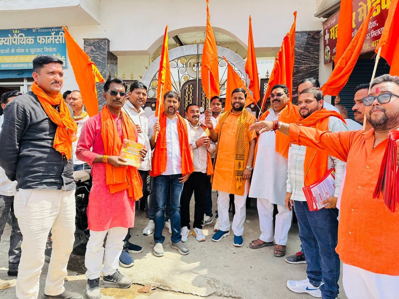 कार्यक्रम के तहत वाराणसी विकास प्राधिकरण बोर्ड के मानद सदस्य अम्बरीष सिंह भोला के नेतृत्व में महावीर बाजार से चमरहा बाजार तक घर-घर जाकर लोगों को भगवा ध्वज वितरित किया गया।